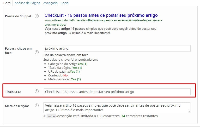 Essa etapa é importante para o SEO do seu artigo. Ao utilizar o plugin WordPress SEO By Yoast você poderá modificar o título do seu artigo para os mecanismos de busca. Ou seja, Você poderá ter um título para os leitores do blog e um título diferente nos buscadores.